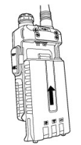 -Deslize para baixo a bateria por cerca de 1 a 2 centímetros, e em seguida, retire a bateria do rádio.