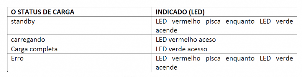 Utilize apenas o carregador especificado pelo fabricante. No carregador há um LED indicado progresso de recarga.